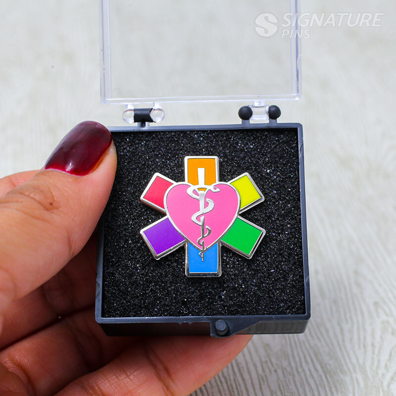 This custom cloisonne pin has a striking design thanks to the red and black color scheme. We've designed all kinds of custom pins for EMS and firefighter teams across the country. What kind of design is perfect for your team?
