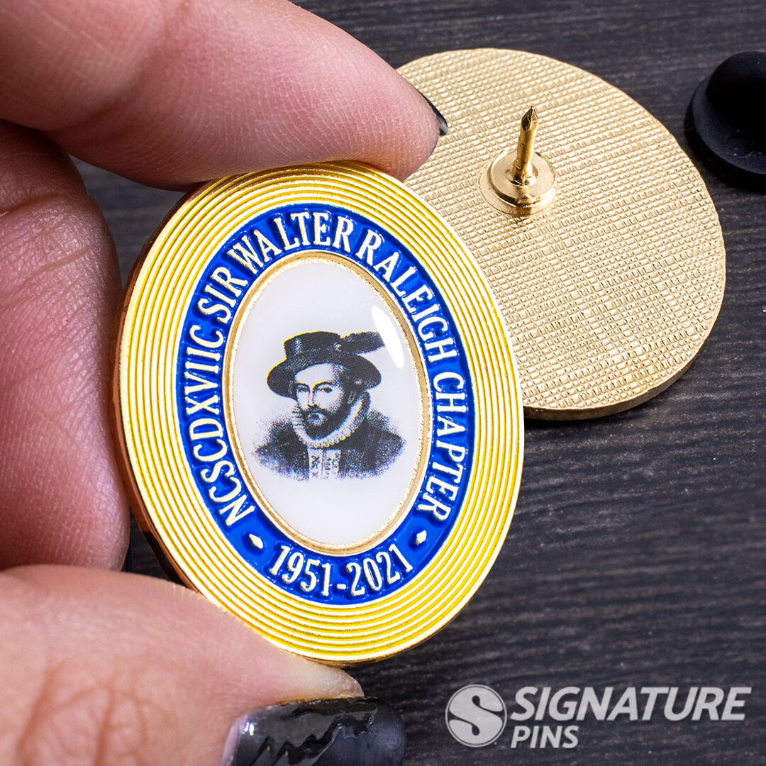 This custom pin design combines offset printing with soft enamel. The photo disk at the center of the design is framed by an elegant soft enamel edge.
